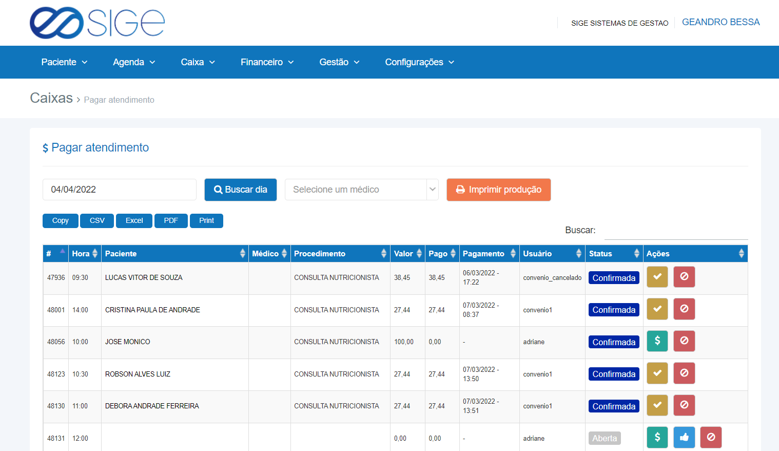 Você terá acesso aos pacientes marcados e confirmados seja ele de convênio ou particular. Em ações você deverá realizar pagamento (caso particular) ou liberar para atendimento (convênio). Também é possível imprimir a produção por colaborador.