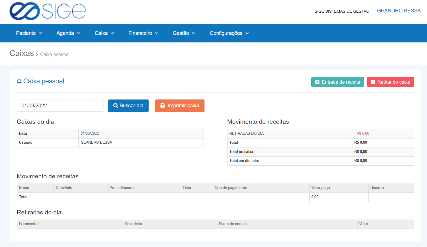 No caixa pessoal você pode escolher o caixa a ser visualizado por data, entrada de receita e retirada de caixa. Aqui também você poderá dar entrada em receitas, retirar do caixa e imprimir um caixa.