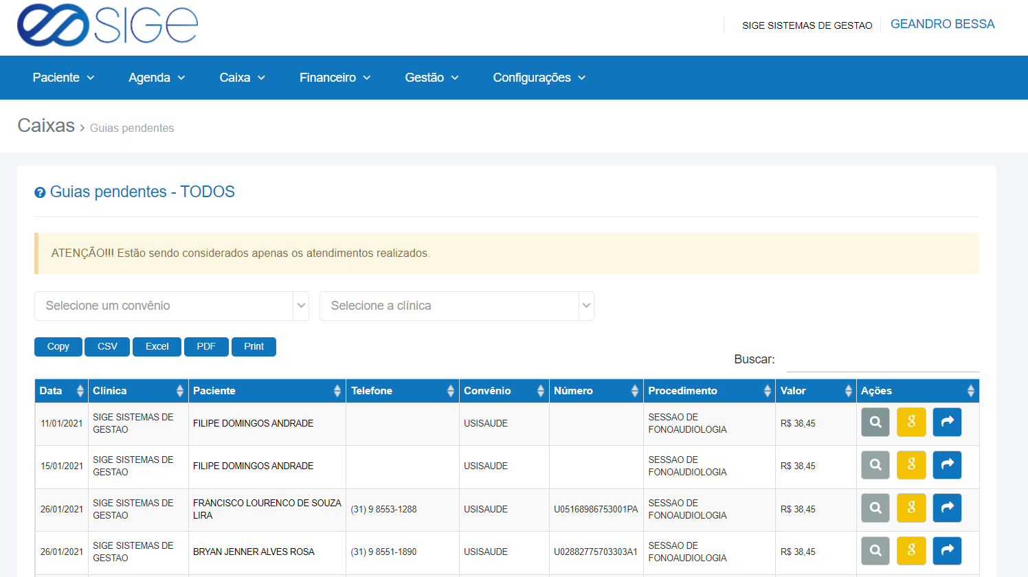 Você irá visualizar todas as guias pendentes de recebimento de cada paciente com atendimento já realizado.