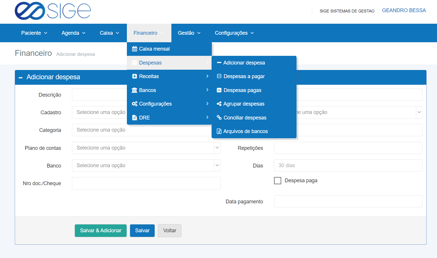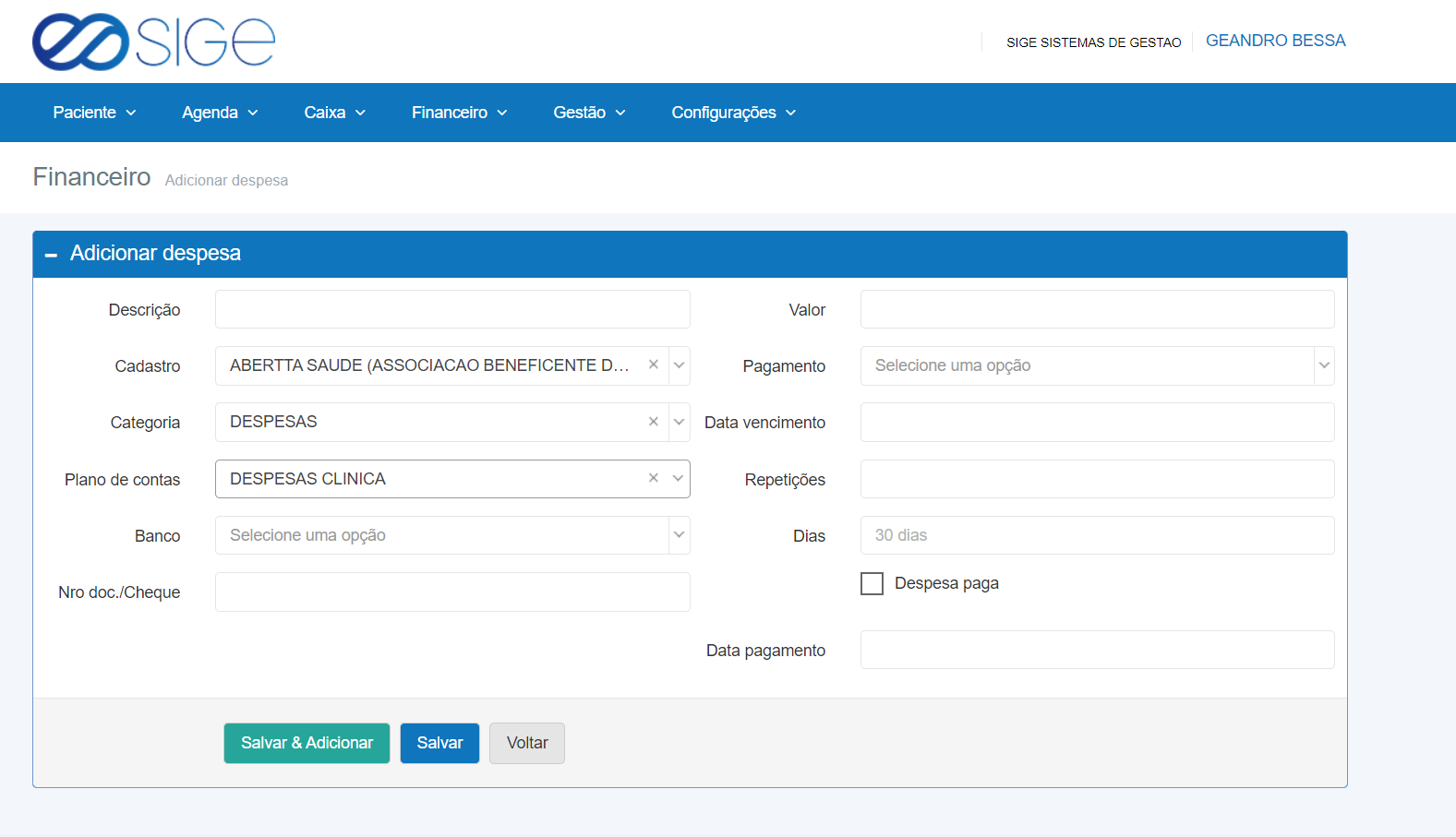 Para adicionar uma despesa, preencha os campos de acordo com o solicitado e clique em salvar e adicionar ou salvar.