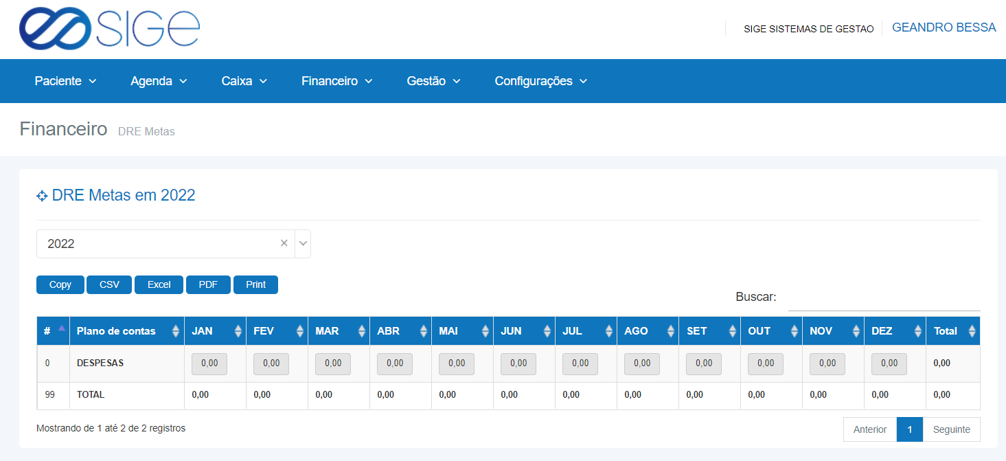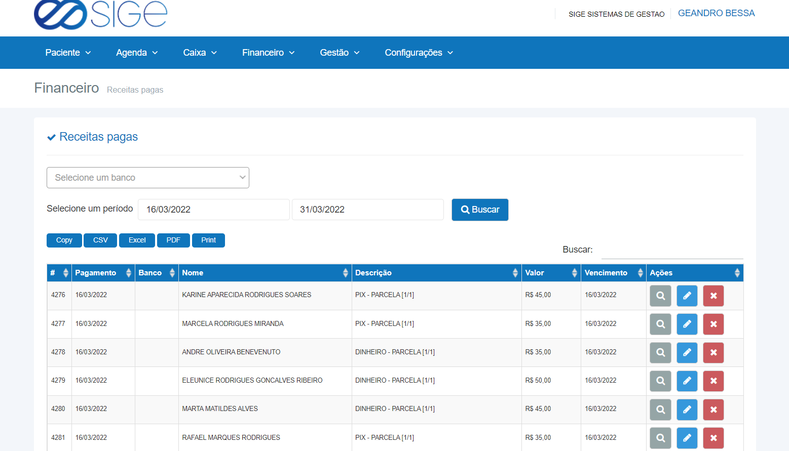 Preencha os campos indicados para buscar uma determinada despesa ou selecione um período desejado. Nessa tela você encontrará em ações: imprimir recibo, visualizar, editar, duplicar ou apagar despesa.