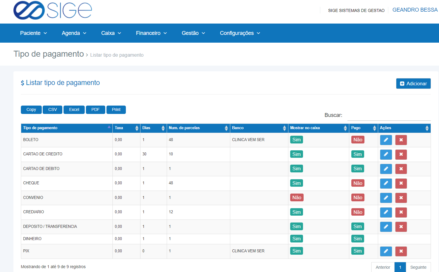 Em Despesas você terá as seguintes abas: adicionar despesas, despesas a pagar, despesas pagas, agrupar despesas, conciliar despesas e arquivos de bancos.