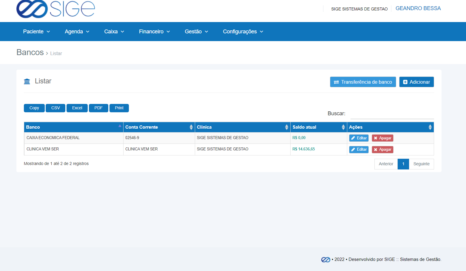 Adicione um novo banco, faça transferência entre bancos, edite as informações do banco ou apague um banco.
