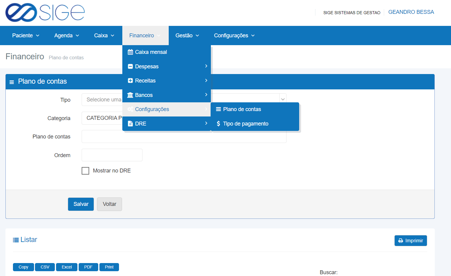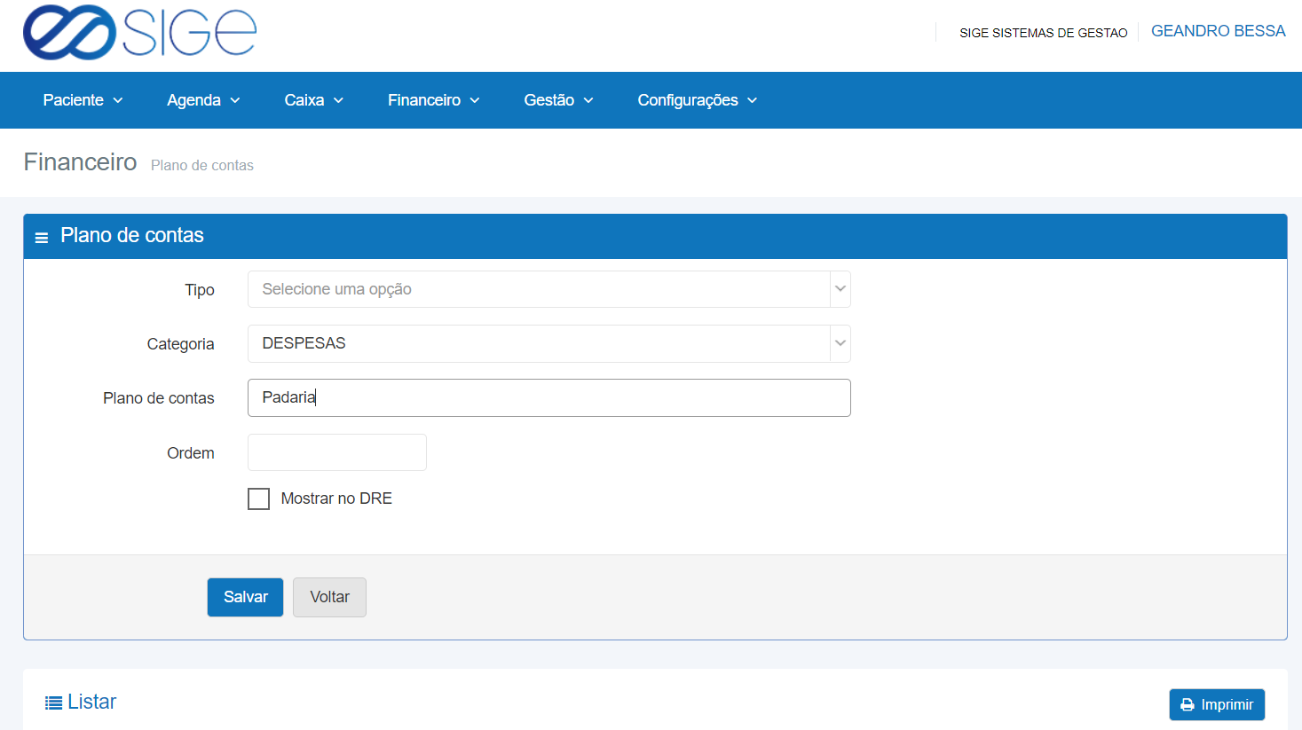 Preencha os campos necessários e clique em salvar para gravar um novo plano de contas. (planos de constas são categorizações das despesas, escolhidas por você ou um gerente, ex: “padaria” , “RH”, “Contrato de Terceiros” , “Material para atendimentos” ) Esse plano de contas é definido por quem utiliza o sistema e aparecerá no DRE.