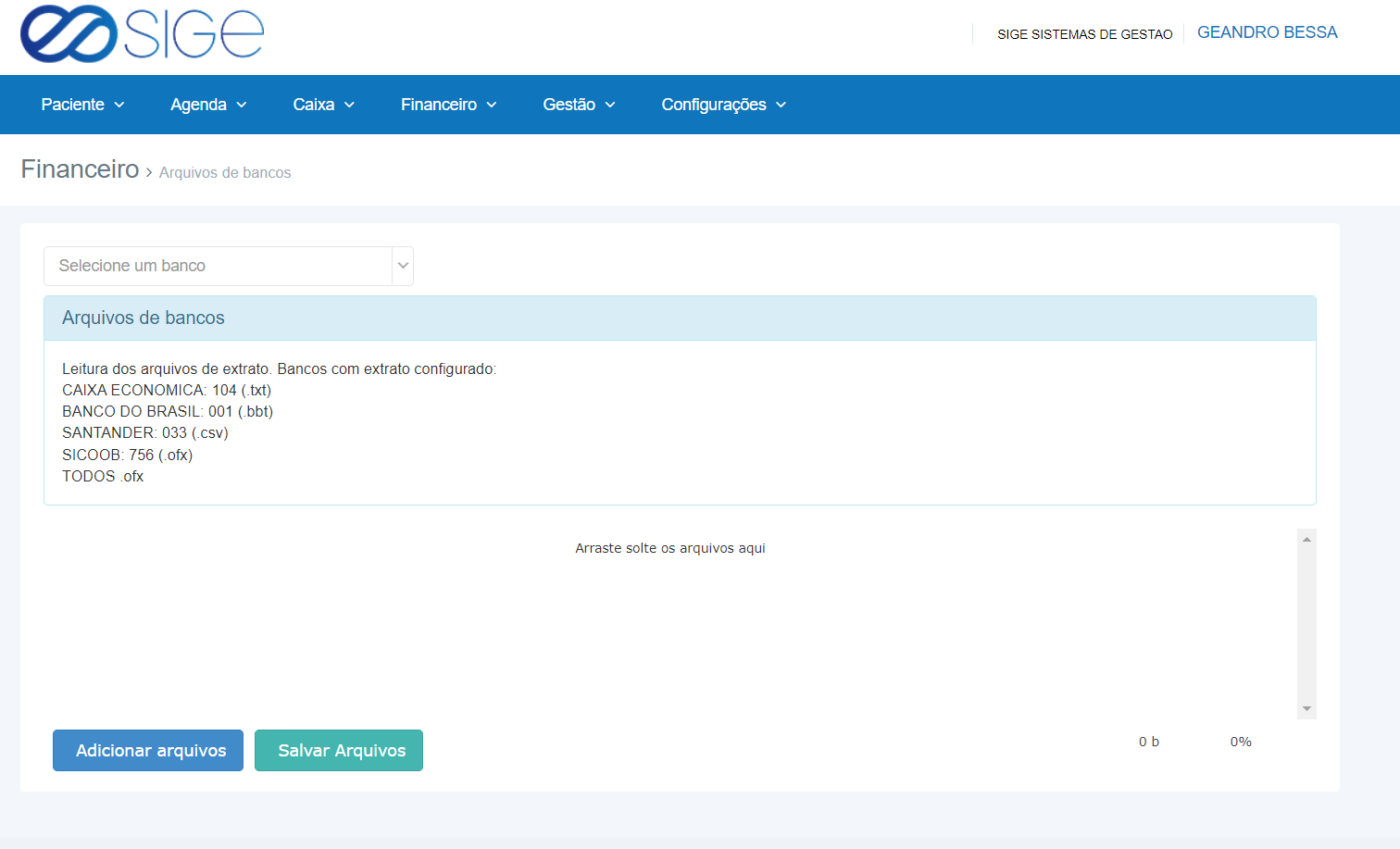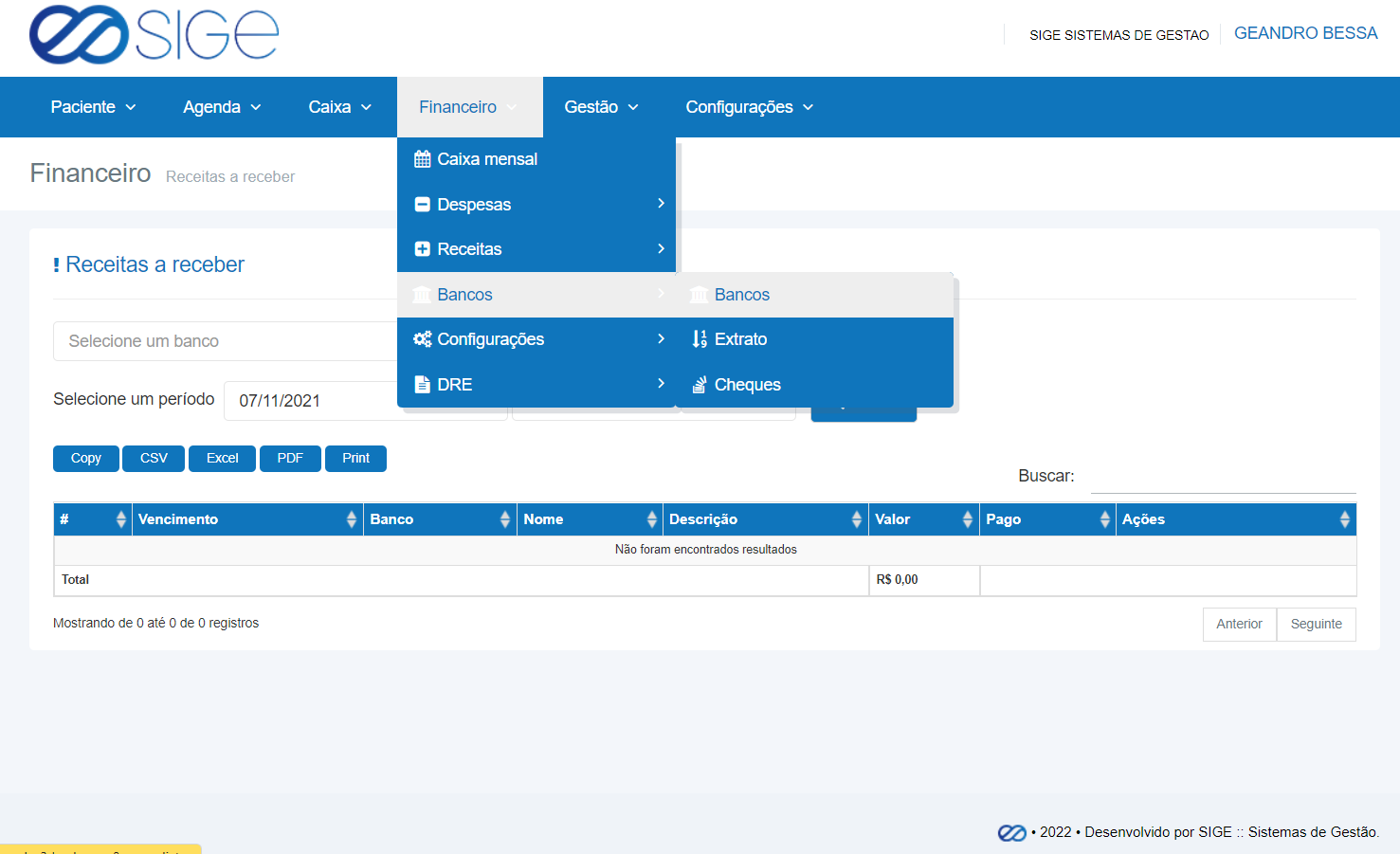 Nessa aba você terá os seguintes menus: bancos, extratos e cheques.
