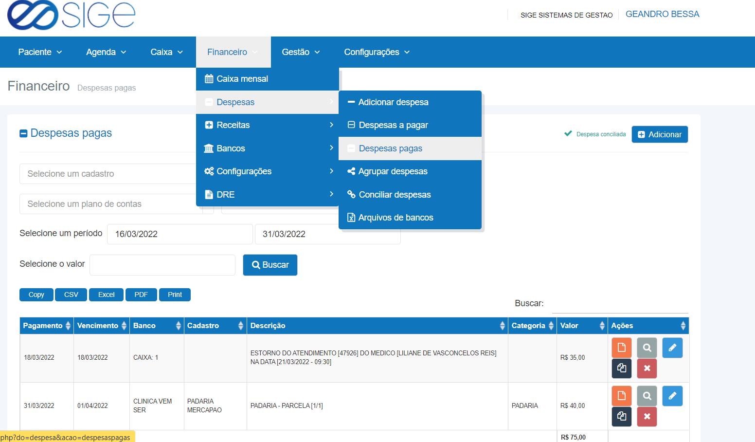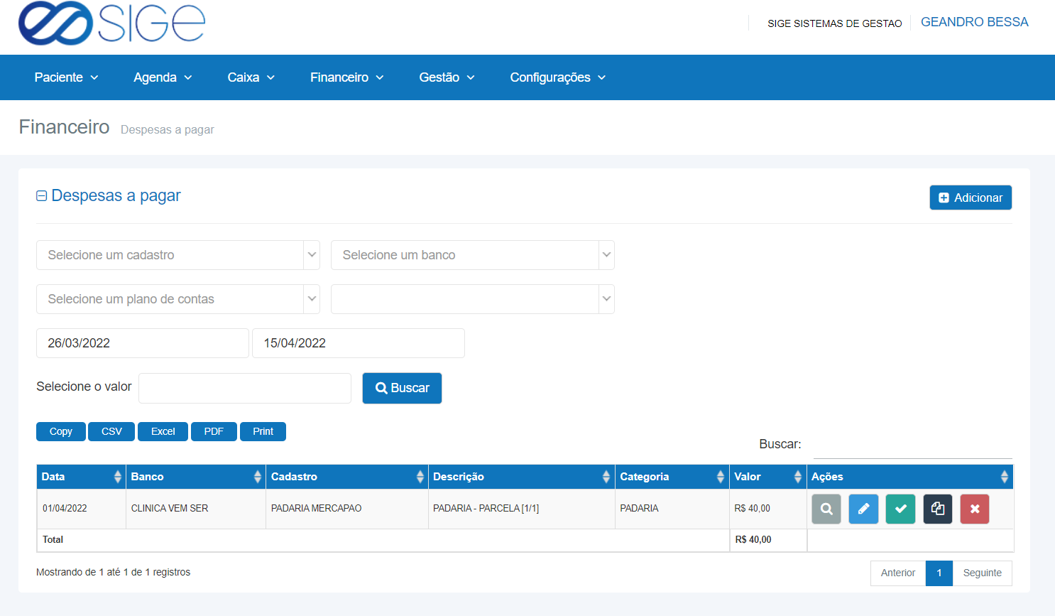 Preencha os campos indicados para buscar uma determinada despesa ou selecione um período desejado. Nessa tela você encontrará em ações: visualizar, editar, pagar, duplicar ou excluir a despesa.