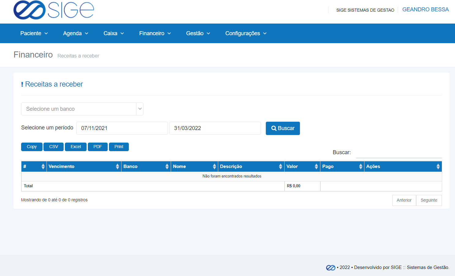 Selecione o banco, e o período desejado para buscar uma receita específica.