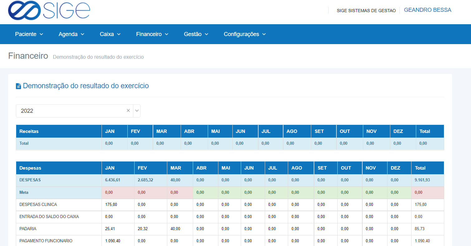 No caixa mensal você irá visualizar todo o movimento do caixa do mês escolhido (atendimento por convênio, por colaborador, receitas por dia, atendimentos por dia, movimentos de receitas, retiradas).