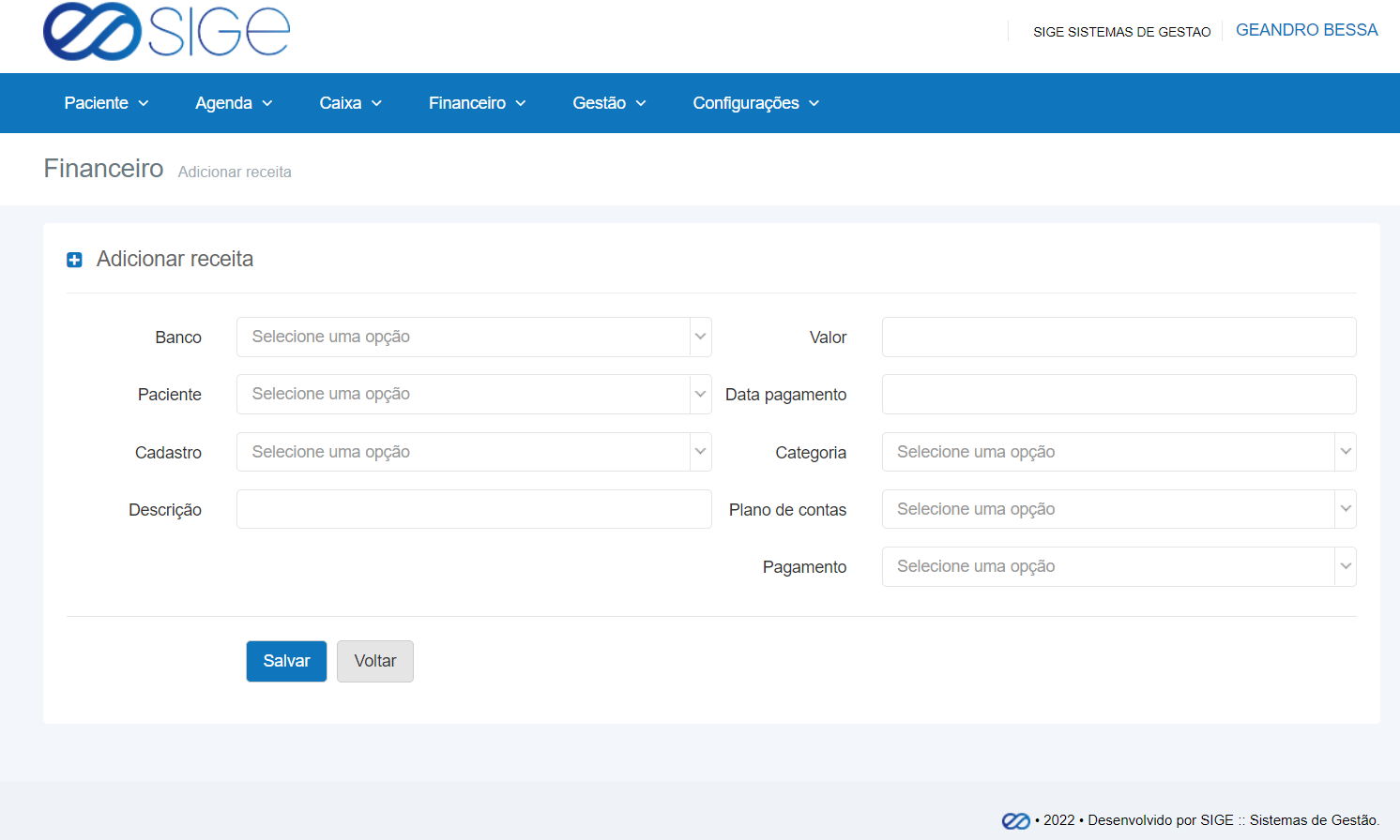 Preencha todos os campos necessários e clique em salvar para adicionar uma receita.