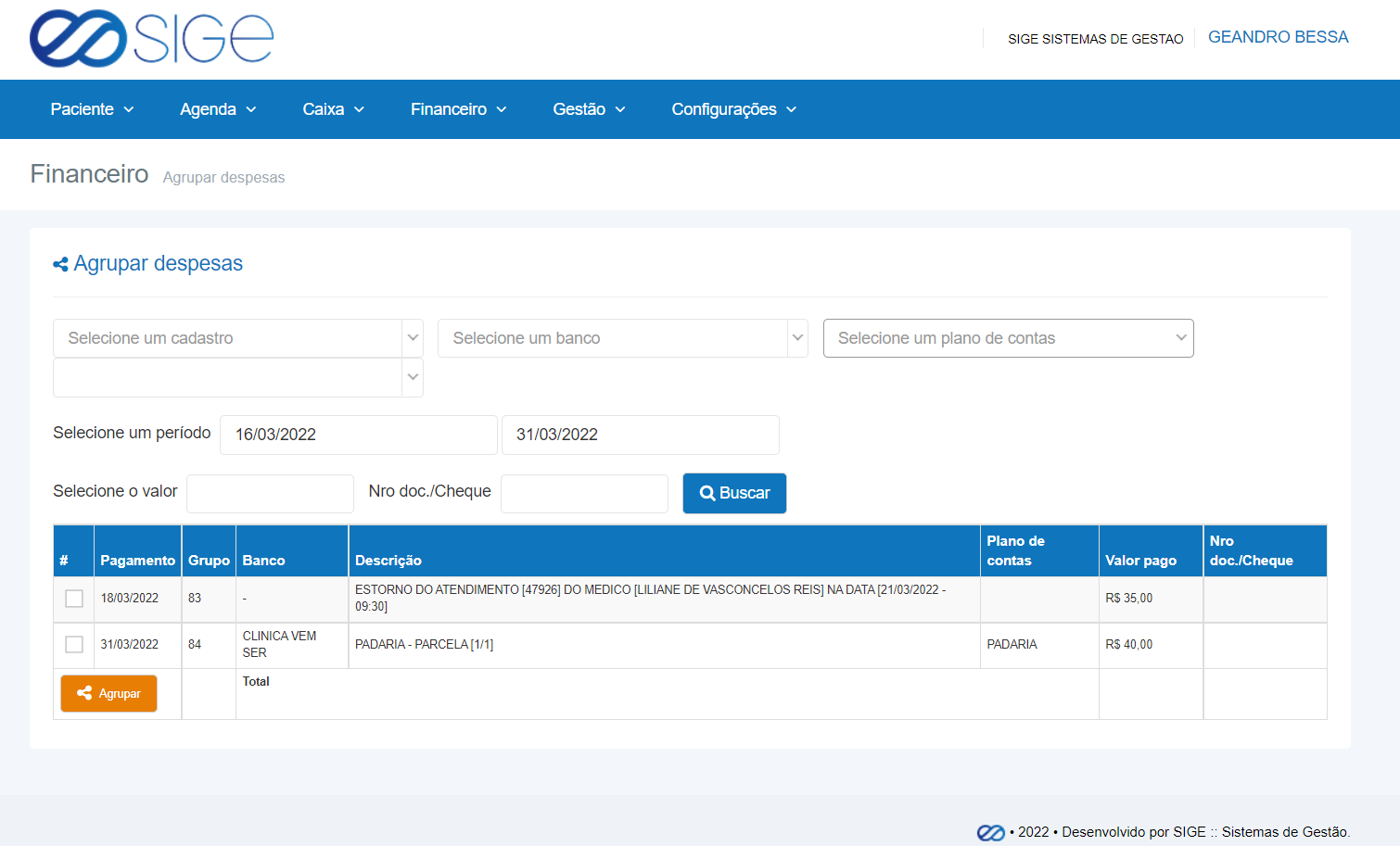 Em agrupar despesas, preencha o campo de acordo com as opções disponíveis e clique em agrupar para realizar o comando (Ex: cartão de crédito, você vai utilizando durante o mês e quando for pagar você agrupa as despesas do cartão que foram realizadas em dias e valores diferentes naquele mês para que dê o valor total para pagamento e o sistema consiga conciliar no extrato).