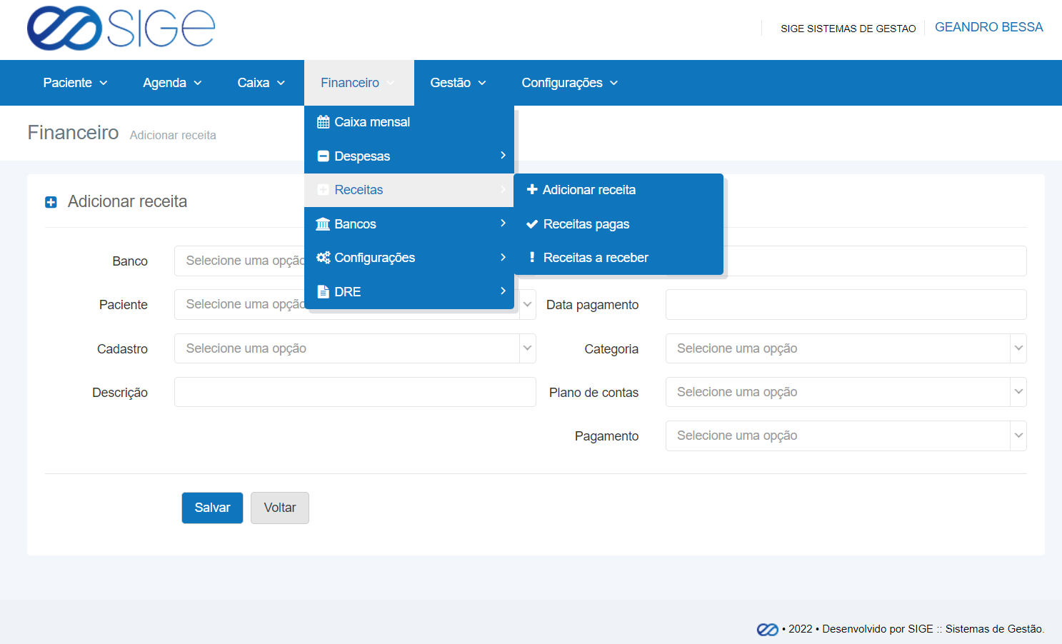 Em Receitas você terá os seguintes menus: adicionar receitas, receitas pagas e receitas a receber.